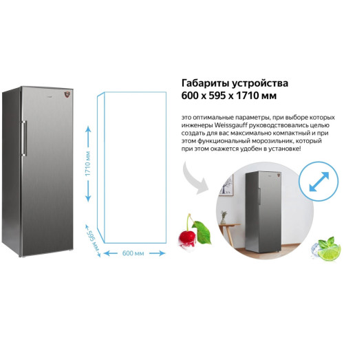 Отдельностоящий вертикальный морозильник Weissgauff c объемом морозильной камеры 225 литров, мощностью замораживания до 14 килограммов в сутки и перенавешиваемой дверью - это по-настоящему эффективный и вместительный помощник в хранении продуктов на вашей кухне. Габариты устройства 600 х 595 х 1710 мм - это оптимальные параметры, при выборе которых инженеры Weissgauff руководствовались целью создать для вас максимально компактный и функциональный морозильник, который при этом окажется удобен в установке. Полностью электронное управление позволит вам буквально в несколько прикосновений настроить параметры морозильника согласно вашим пожеланиям, что сделает работу с данной моделью еще более удобной и комфортной. Перенавешиваемая дверь позволит вам самостоятельно выбрать, в какую сторону будет осуществляться открывание морозильника, что особенно важно при планировании его размещения. Мощность замораживания до 14 кг/сутки это достаточно высокий показатель, позволяющий вам с легкостью разместить в морозильник сразу большой объем свежих продуктов.