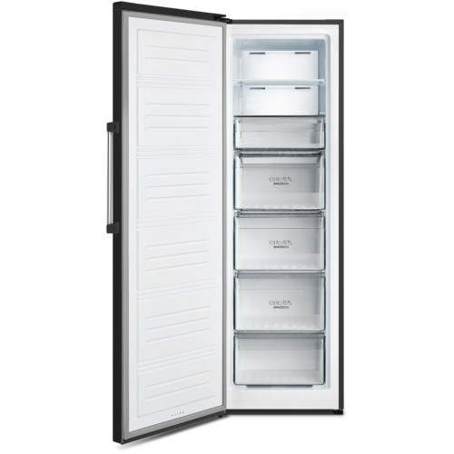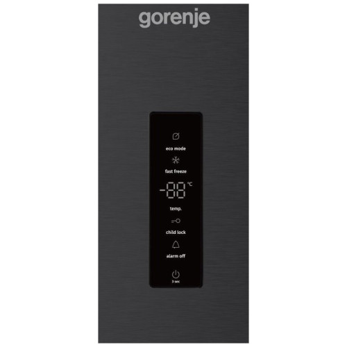 Морозильный шкаф Gorenje FN619FPB выполнен в черном матовом цвете, который дополнит и подчеркнет особенность любой кухни. Модель имеет удобные габариты, сербские производители позаботились об удобстве ее встраивании. Ее размеры: высота — 185,5 см, ширина — 59,5 см, глубина — 66,6 см. Материал товара — нержавеющая сталь, что гарантирует долгий срок службы прибора. Шкаф имеет электронный тип управления. На его дверце представлен цифровой дисплей, с помощью которого можно быстро посмотреть температуру внутри камеры, а также активировать различные режимы. Система NoFrost — конструктивное решение, при котором испаритель внесен в отдельный отсек, где и происходит охлаждение воздуха. Благодаря такой компоновке в морозильном отделении снижается влажность, а значит, лишняя вода не оседает на стенках и не превращается в наледь. Режим морозильного шкафа Gorenje FN619FPB FastFreeze быстро замораживает продукты и сохраняет полезные свойства овощей и фруктов. Теперь ваши продукты будут свежими и полезными даже в замороженном виде. Общий полезный объем оборудования составляет 260 л. Данная модель обладает автоматическим размораживанием, она способна долго автономно сохранять холод и замораживать одновременно 14 кг/сутки. При отключении электроэнергии прибор будет поддерживать температуру в течение 15 часов. Если Вы случайно забыли закрыть дверцу, то сработает звуковой сигнал. Это обеспечивает безопасность эксплуатации. Светодиодное освещение позволяет с удобством обозревать продуктовые запасы, не доставая их из морозильника или, наоборот, оптимальным размещать внутри новые упаковки.