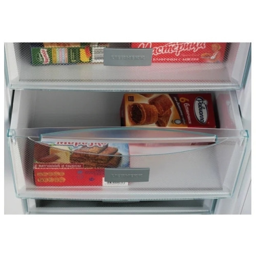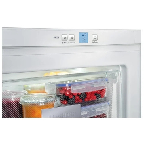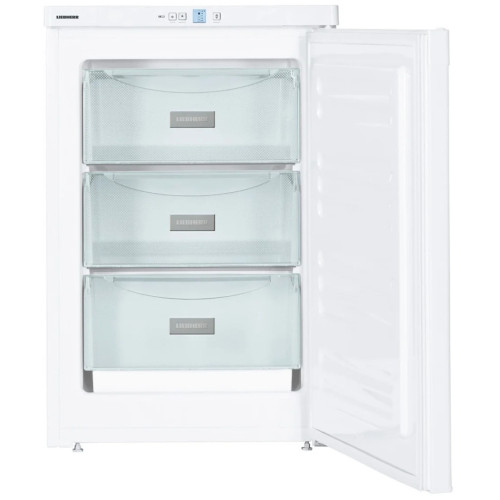 Небольшой, всего 85,1?55,3?62,4 размерами, морозильный шкаф, предназначенный для встраивания в столешницу, удобен, прежде всего, своей незаметностью и экономией пространства. Дверной упор расположен справа, однако если такая конфигурация неудобна, можно перевесить дверцу на другую сторону. Встроенная ручка не цепляется за одежду и не создаёт проблем при сокрытии её дополнительной деревянной дверью. Полезный объём камеры составляет 98 л. Система FrostSafe обеспечивает наиболее комфортную конструкцию из трёх пластмассовых ящиков, герметично закрытых и минимизирующих отдачу холода при закладке или изъятии новой порции продуктов. Также она включает в себя особую структуру испарителя. Вместе эти меры минимизируют осаждение инея на стенках и поверхности содержимого, что положительно влияет на длительность хранения заморозок и на работу устройства целиком. Максимальная мощность замораживания составляет 11 кг/сутки. Режим SuperFrost позволяет быстро и эффективно заморозить большое количество продукции с сохранением всех её полезных веществ. Эта опция часто используется для заготовки овощей и ягод без потерь вкусовых свойств, а также витаминов. Об активации этой и других функций уведомит дисплей в верхней части модели. Электронная панель посредством кнопок позволит, помимо прочего, отрегулировать температурные настройки. Приятным дополнением станут регулируемые ножки Liebherr G 1213 Comfort и возможность установки его вплотную к стене. Кроме этого, полезнейшими особенностями являются экономичность и автономное сохранение температуры в течение 26 часов. Следует отметить, что не рекомендуется использовать оборудование в температурных условиях ниже ?15?С.