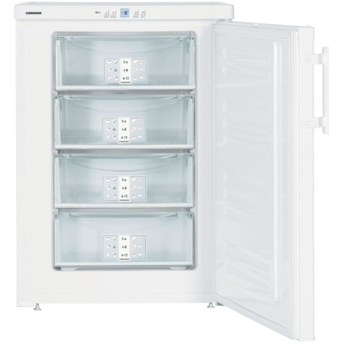 Морозильный шкаф Liebherr GP 1476 замораживает и сохраняет продукты свежими на протяжении длительного времени. Внешний вид шкафа напоминает обычный малогабаритный холодильник – при глубине 62.8 см высота оборудования составляет 85.1 см, а ширина — 60.2 см. Данная камера способна стабильно поддерживать заданный температурный режим. В морозильном шкафу объемом 103 литра одна камера с четырьмя разделенными ящиками. На замороженных продуктах образуется значительно меньше инея благодаря использованию в устройстве технологии