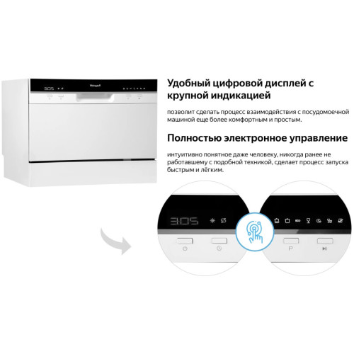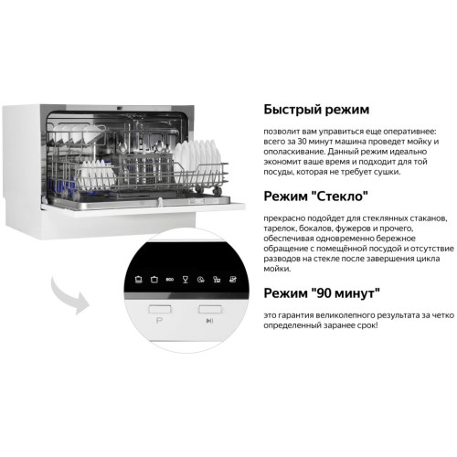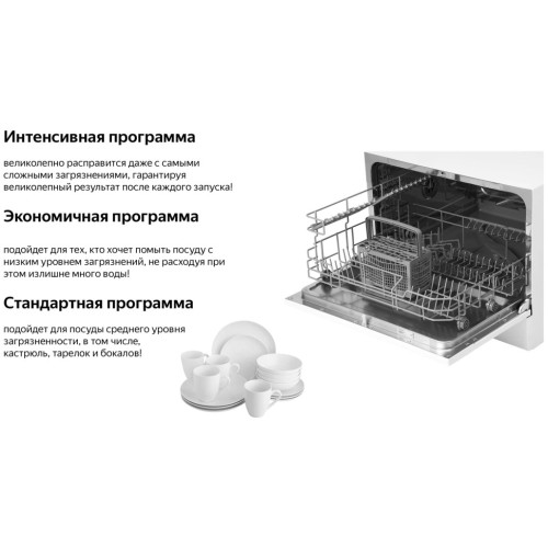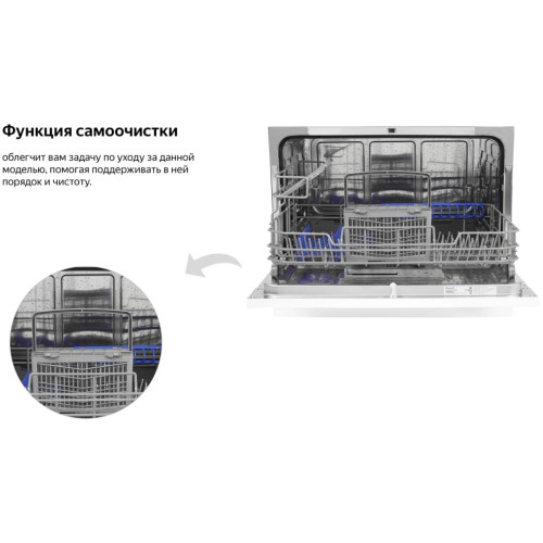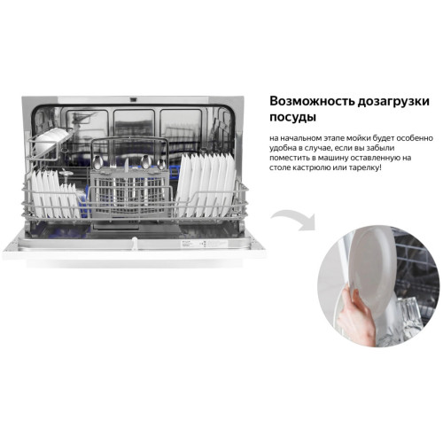 Настольная посудомоечная машина Weissgauff оснащена функцией самоочистки, полностью электронным управлением и богатым набором из 7 программ - это модель, которая отличается не только компактностью, но и высокой и функциональностью. Компактный настольный дизайн сделает данную посудомоечную машину настоящим украшением любой кухни, объединяющим в себе уникальный стиль и непревзойденную эргономичность. До 6 комплектов посуды одновременно вы можете расположить в данной посудомоечной машине, благодаря современным продуманным и эргономичным корзинам, которыми Weissgauff оснастили эту модель Удобный цифровой дисплей с крупной индикацией позволит сделать процесс взаимодействия с посудомоечной машиной еще более комфортным и простым Функция самоочистки облегчит вам задачу по уходу за данной моделью, помогая поддерживать в ней порядок и чистоту. Таймер до 24 часов, который особенно удобен, если вы ходите начать цикл мытья в ночное время или во время вашего отсутствия. Всего лишь загрузите посуду в камеру, нажмите одну единственную кнопку - и всё остальное машина сделает сама! Возможность дозагрузки посуды, на начальном этапе мойки будет особенно удобно в случае, если вы забыли поместить в машину забытую на столе кастрюлю или тарелку! Полностью электронное управление, интуитивно понятное даже человеку, никогда ранее не работавшему с подобной техникой, сделает процесс запуска быстрым и лёгким.
