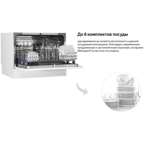Настольная посудомоечная машина Weissgauff оснащена функцией самоочистки, полностью электронным управлением и богатым набором из 7 программ - это модель, которая отличается не только компактностью, но и высокой и функциональностью. Компактный настольный дизайн сделает данную посудомоечную машину настоящим украшением любой кухни, объединяющим в себе уникальный стиль и непревзойденную эргономичность. До 6 комплектов посуды одновременно вы можете расположить в данной посудомоечной машине, благодаря современным продуманным и эргономичным корзинам, которыми Weissgauff оснастили эту модель Удобный цифровой дисплей с крупной индикацией позволит сделать процесс взаимодействия с посудомоечной машиной еще более комфортным и простым Функция самоочистки облегчит вам задачу по уходу за данной моделью, помогая поддерживать в ней порядок и чистоту. Таймер до 24 часов, который особенно удобен, если вы ходите начать цикл мытья в ночное время или во время вашего отсутствия. Всего лишь загрузите посуду в камеру, нажмите одну единственную кнопку - и всё остальное машина сделает сама! Возможность дозагрузки посуды, на начальном этапе мойки будет особенно удобно в случае, если вы забыли поместить в машину забытую на столе кастрюлю или тарелку! Полностью электронное управление, интуитивно понятное даже человеку, никогда ранее не работавшему с подобной техникой, сделает процесс запуска быстрым и лёгким.