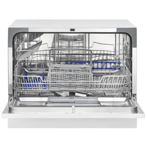 Посудомоечная машина рассчитана на 6 комплектов посуды. Она пригодится тем чистюлям, которые станут запускать ее после каждого приема пищи. Поместить в такую машину большую сковороду или кастрюлю не получится, но избавить от рутины с тарелками и чашками ей удастся. Посудомойки 5 программ, среди которых стандартная, экономичная, быстрая, интенсивная для сильно загрязненной посуды. За один обычный цикл машина расходует всего 6,5 л воды – гораздо меньше, чем понадобилось бы, чтобы вымыть такое количество стаканов и тарелок вручную.