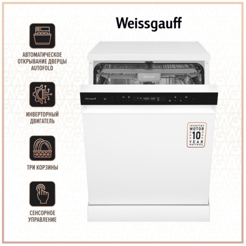Weissgauff DW 6038 Inverter Touch - полноразмерная отдельностоящая посудомоечная машина Weissgauff с автоматическим открыванием дверцы по завершении цикла, инверторным двигателем, сенсорным управлением, тремя корзинами и вместимостью посуды до 14 комплектов - это одна из наиболее передовых моделей 2022 года среди посудомоечных машин Weissgauff! Автоматическое открывание дверцы AutoFold - по окончании цикла позволяет воздуху циркулировать естественным образом, обеспечивая в несколько раз более высокую эффективность сушки, чем у любой другой системы с закрытой дверцей! До 14 комплектов посуды одновременно вы можете расположить в данной посудомоечной машине, благодаря современным продуманным и эргономичным корзинам, которыми мы оснастили эту модель! Инверторный двигатель, обеспечивающий более экономичное энергопотребление, пониженный уровень шума и оптимизированный расход воды! Три корзины, позволяющие разместить отдельно от остальной посуды в верхнем лотке сразу все ложки, вилки и ножи, обеспечивая при этом их наилучшее мытьё! Вертикальная регулировка средней корзины по высоте позволит легко выставить нужное положение, даже если корзина уже загружена посудой! Складные стойки нижней корзины Mobil St?tze, позволят с удобством использовать её как для размещения дополнительных блюдец и тарелок, так и для более крупной посуды, такой как кастрюли и сковороды! Сенсорная панель управления Touch Control это настоящая гордость Weissgauff, ведь каждый элемент на панели реагирует с первого прикосновения, даже в том случае, если ваши руки прохладные или влажные. Легкость управления, ощущаемая буквально