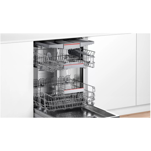 Габариты: 86.5x59.8x55 смКол-во комплектов посуды: 14Управление: электронноеКласс мытья: AКласс сушки: AКласс энергопотребления: AУровень шума: 44 дБПрограммы:Эко 50 C°, Авто 45-65 C°, Интенсивная 70 C°, Быстрая 65 C°, Ночная программа 50 C°, Предварительное полосканиеДополнительные функции:1/2 загрузкаHygienePlusSpeedPerfectPlusСамоочистка Machine CareТаймер запуска 124 чУправление и индикация:Панель управления сверхуСистемы безопасности:Система AquaStop обеспечивает защиту от любых протечек, как внутри прибора, так и в случае разрыва заливного шланга. В случае, если система AquaStop не сработает, компания BSH гарантирует возмещение ущерба, связанного с протечкой. Гарантия на возмещение ущерба действительна весь срок службы прибора - 10 лет.Оснащение:Колеса с низким коэффициентом трения на нижнем стеллаже и 3-м уровне загрузкиСтопоры на передних колесах нижней корзины предотвращают сход корзины с направляющихТри положения верхнего короба с системой Rackmatic-3, легко переставить по высоте даже при полной загрузкеСкладные направляющие для тарелок в верхнем коробе (2)Складные направляющие для тарелок в нижнем коробе (2)Полка для мытья чашечек эспрессо в верхнем коробе (2х)Дополнительная информация:Tеплообменник.Специальный отсек DosageAssist в ручке короба обеспечивает своевременное и равномерное растворение комбинированных моющих средств (таблеток и капсул)Бесщёточный мотор EcoSilenceDrive с инверторным управлением обеспечивает эффективную работу с минимальным уровнем шума и сокращает расход водыПосудомоечная машина подстраивается под тип моющего средства, обеспечивая оптимальный результат мытьяТрёхкомпонентный самоочищающийся фильтрВнутренние стенки прибора из нержавеющей сталиСлишком мягкая вода может стать причиной коррозии стекла. В посудомоечных машинах с технологией