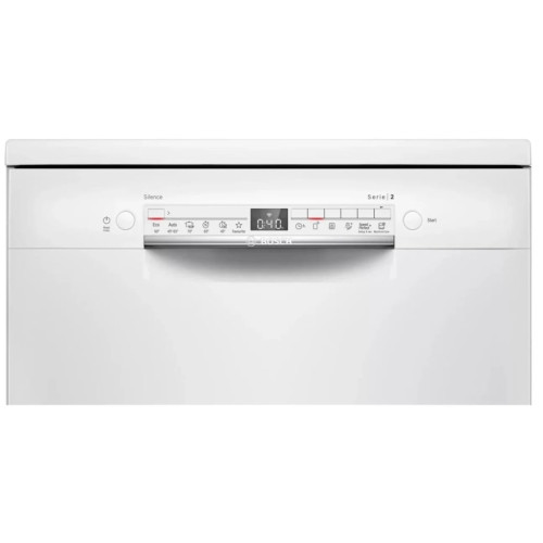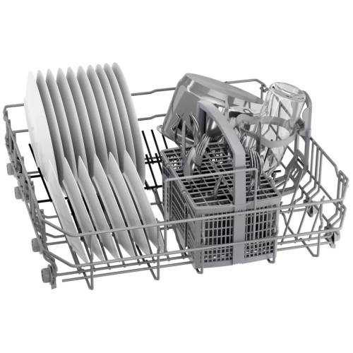 Посудомоечная машина Bosch SMS2HKW1CR шириной 60 см призвана избавить вас от большой части кухонных хлопот. Внутри камеры помещается 12 комплектов столовых принадлежностей, так что модель отлично подойдёт для семьи из трёх-четырёх человек. Инверторный двигатель обеспечивает устройству бесперебойную работу на протяжении всего срока службы. Плюс такой мотор отвечает за сниженное расходование воды и ресурса электросети. Бытовой помощник оснащён простой в освоении панелью управления, которая представлена кнопочным меню и наглядным цифровым дисплеем. Для выбора одного из пяти режимов, например мини-программы длительностью 29 минут, или активации отложенного запуска достаточно пару разу нажать на отзывчивые клавиши. Прибор поставляется с двумя вместительными выдвижными корзинами: нижняя оптимально подходит для сковород, кастрюль и форм для выпечки, а верхняя – для различных тарелок, блюдец, кружек и стаканов. Кроме того, предусмотрен и третий уровень загрузки для ложек, вилок и ножей. Процесс сушки происходит естественным, а именно конденсационным путём. В результате финишной обработки горячей водой образуется пар, оседающий на стенках в виде капель. Они, в свою очередь, стекают в специальный резервуар, откуда откачиваются при помощи насоса. Не беспокойтесь о том, что машина станет причиной затопления вашей и соседских квартир. Об этих опасениях вы сможете забыть благодаря надёжной системе полной защиты от протечек.