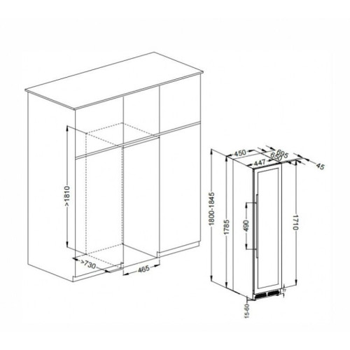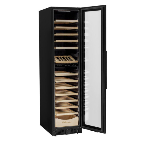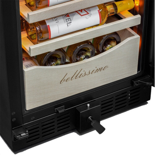 Продвинутый функционал и комплектация винного шкафа MV106-KBT2 (Slim) от итальянского бренда Meyvel создаёт одну из самых высококачественных систем для профессионального и длительного хранения различных сортов вин. Внутри шкафа поддерживается влажность в диапазоне 60-80%, как в настоящем винном погребе. Этот винный холодильник отлично впишется в любой кухонный гарнитур благодаря своим размерам. Это одна из немногих моделей, у которой ширина всего 45 см. Несомненно, Вас порадует наличие панорамного светодиодного освещения (подсвечивает каждую полку), которое имеет три цвета - белый, янтарный и синий. Оно не выделяет тепло и следовательно - не нагревает бутылки с вином. Так что Вы сможете эффектно демонстрировать Вашу винную коллекцию. Благодаря встроенной вентиляции и отсутствию выступающих частей, эта модель может быть не только отдельно стоящей, но и устанавливаться в нишу с минимальными зазорами. Дверь имеет скрытые петли и не требуют дополнительных вырезов в нише. Дверь может открываться слева или справа. Для изменения направления открывания двери её можно перенавесить. (Стандартное исполнение - петли справа). Благодаря возможности перенавешивания двери, Вы можете установить два винных шкафа рядом и организовать систему Side-by-Side. Так же, из важных функций в этой модели есть сигнализация открытой двери, сигнализация отклонения температуры, автоматическая разморозка, «Зимний режим» и режим «Шаббат». MV106-KBT2 (Slim) отлично подойдёт и для ресторанов. Вмещает до 110 бутылок типа «Бордо», а стильный дизайн отлично выглядит в любом интерьере. (Ручка, вентиляционная решётка и замок выполнены в цвете корпуса). 14 полок из массива бука оснащены выкатным механизмом, который обеспечить надёжное и лёгкое выдвижение. Этот натуральный и крепкий материал не только имеет красивую текстуру, но и прекрасно гасит небольшую вибрацию. В каждой зоне есть полка с увеличенным пространством. На таких полках Вы сможете разместить не только стандартные бутылки Бордо, но и Магнум. А если нужно разместить что-то побольше - то в этом случае можно вынуть одну или несколько полок. Одна из полок сделана в виде специальной полки-трансформера. Её можно использовать как стандартную полку, или как демонстрационную. В этом случае бутылки будут располагаться под наклоном, для демонстрации Вашей винной коллекции. Внизу винного шкафа расположен выдвижной ящик - в нем Вы можете хранить вино в бутылках или винные атрибуты (штопор, бокалы, аэраторы, декантеры, каплеуловители, термометры и т.д.).
