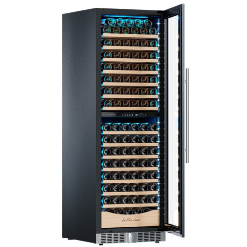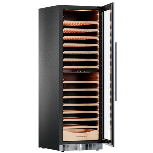Винный шкаф предназначен для профессионального и длительного хранения различных сортов вин (до 174 бутылок типа Бордо). Он так же оснащен дверью с защитой от ультрафиолетовых лучей и поддерживает влажность в диапазоне 60-80%, как в настоящем винном погребе. Стильный шкаф MV163PRO-KBT2 сочетает в себе неподвластное времени очарование, а так же качество натуральных материалов и высоких технологий. MV163PRO-KBT2 может устанавливаться как отдельно, так и встраиваться в нишу. За счёт того, что верхняя петля двери не выступает за пределы корпуса и шкаф оснащён встроенной системой вентиляции - эта модель устанавливается в нишу с минимальными зазорами. Внутреннее пространство винного шкафа разделено на две температурные зоны. Вы сможете настроить их так, что бы хранить все виды вина при идеальной температуре или установить разные значения, что бы напитки всегда были готовы к подаче. Так же в каждой зоне есть полка с увеличенным пространством. На таких полках Вы сможете разместить не только стандартные бутылки Бордо, но и Магнум. А если нужно разместить что-то побольше - то в этом случае можно вынуть одну или несколько полок. Внизу есть выдвижной ящик - в нем Вы можете хранить вино в бутылках или винные атрибуты (штопор, бокалы, аэраторы, декантеры, каплеуловители, термометры и т.д.). Идеальной температурой хранения вина считается температура +12°C. Подаются розовые и сухие белые вина обычно при температуре от +8°C до +14°C, игристые вина и шампанское при +6°C до +8°C, а легкие красные вина - при +13°C и насыщенные красные вина при +15°C - +19°C. Винный холодильник оснащён надёжным и экономичным компрессором. Ручка, вентиляционная решётка и замок выполнены в цвете корпуса. Полки выполнены из массива бука. Этот натуральный и крепкий материал не только имеет красивую текстуру, но и прекрасно гасит небольшую вибрацию. Так что Ваше вино будет храниться в абсолютном покое. Дверь может открываться как слева, так и справа. А это значит, что при покупке двух винных холодильников, Вы сможете расположить их Side by Side. Несомненно, Вас порадует наличие панорамного светодиодного освещения (подсвечивает каждую полку), которое имеет три цвета - белый, янтарный и синий. Оно не выделяет тепло и следовательно - не нагревает бутылки с вином. Так что Вы сможете эффектно демонстрировать Вашу винную коллекцию. Наличие угольного фильтра помогает устранять внутри шкафа посторонние запахи, которые могут повлиять на вкус вина. Менять его рекомендуется 1 раз в год. Дополнительно рекомендуем приобрести сразу 2-3 фильтра, чтобы при необходимости он всегда был под рукой. Так же, из важных функций в этой модели есть сигнализация открытой двери и отклонения температуры, автоматическая разморозка и зимний режим, который подогреет внутреннее пространство, если температура в помещении опустилась ниже заданной. Управление сенсорное с функцией блокировки. Есть режим «Эко-демо» и память настроек. Преимущества винного шкафа Meyvel MV163PRO-KBT2: * Идеально подходит для дома и ресторана; * Можно установить в нишу или отдельно; * Встроенная система вентиляции; * Перенавешиваемая дверь; * Возможность устанавливать два шкафа Side by Side; * Ручка и замок в цвет корпуса; * Две температурные зоны для хранения вин и подготовки их к подаче; * Полки из массива бука отлично гасят вибрацию; * Полка с увеличенным пространством (в каждой зон