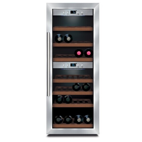 Винный холодильник CASO WineMaster 38 на две температурные зоны, с вместимостью каждой зоны по 19 бутылок. Металлический корпус и дверь из специального стекла с УФ-фильтром и нержавеющей стали обеспечивают надежную защиту содержимого от ультрафиолетового излучения. Модель оборудована семью полками из деревянного массива и компрессорной динамической охлаждающей системой, производящей минимум шума. Система управления позволяет задавать температуру для каждой из зон, панели управления сенсорные, расположены в верхней части каждой дверцы. Винный холодильник CASO Winemaster 38 идеально подойдет для дома ценителя вина или небольшого кафе, весьма удачно вписавшись в интерьер.