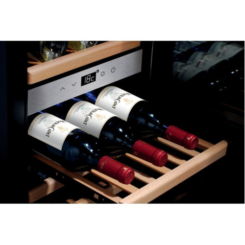 Двузонный компрессорный винный холодильник, предназначенный для хранения вина в температурном диапазоне от 5 до 20°C. Верхняя зона предназначена для хранения белых и игристых вин, нижняя – для розовых и красных. Зоны работают автономно, каждая оборудована собственным контуром охлаждения и панелью управления. Компрессор подвешен на резиновых демпферах, что снижает вибрации, губительные для вина. Семь съемных полок из дерева предназначены для правильного хранения вина: бутылки кладутся горизонтально (вместительность – 38 бутылок). Управление осуществляется при помощи двух сенсорных панелей внутри холодильника. Регулировка температурных показателей с шагом в 1°C происходит нажатием « ∧ » и «∨». Управление внутренним освещением возможно при помощи кнопки «Свет». Красивая подсветка силуэтов бутылок синим цветом, обеспечивается за счет светодиодных панелей. Встроенные светодиоды не нагреваются, и внутренний микроклимат остается максимально благоприятным для хранения бутылок. Винный шкаф оснащен одной камерой, не шумит в работе, идеально подходит для гостиничных номеров или небольших квартир. На стеклянной дверце устройства имеется специальный UV-фильтр, который защищает вино от прямого воздействия солнечных лучей. Стальной корпус стойкий к царапинам. Уход за оборудованием осуществляется с помощью неагрессивных моющих средств.