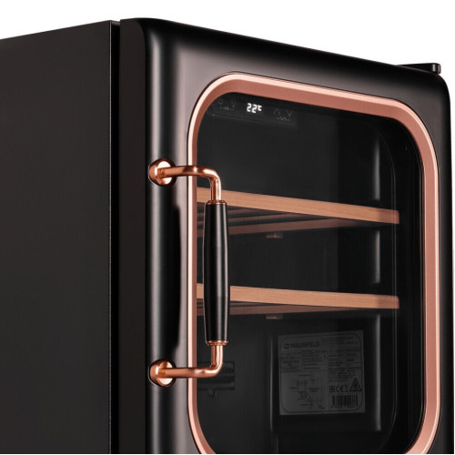 Современный винный шкаф в ретро стиле MFWC-4014 – инновационное решение проблемы качественного хранения вина. Расширенная функциональность, изысканный дизайн, полноценная имитация условий «винного погреба» – всё это винный шкаф MFWC-4014. В нем можно хранить до 14 бутылок при температуре от 5 ° C до 20 ° C. Напитки нужной температуры, всегда готовые к подаче. Широкий температурный диапазон винного шкафа (от 5 ° C до 20 ° C) позволит хранить красные, белые и игристые вина, а также подготавливать их к подаче. Винный шкаф MFWC-4014 в полной мере обеспечивает сохранность вина при правильной температуре, позволяет напитку дозревать, раскрывая его вкус и аромат. Внутреннее пространство рассчитано на хранение до 14 бутылок. При желании можно извлечь полку и разместить большее количество бутылок. Для размещения винных бутылок, шкаф оснащен 2 крепкими полками из массива бука. Модель станет прекрасным дополнением в дизайнером решение в с стиле ретро. Современная технология освещения зоны позволит вам в любое время эффектно продемонстрировать вашу винную коллекцию гостям. Каждая деталь модели гармонично дополняет друг друга, делая винный шкаф универсальным под любые стили интерьера. Дверца шкафа выполнена из тонированного стекла с защитой от УФ лучей. Управляйте всеми функциями винного шкафа с помощью интуитивно-понятной сенсорной панели управления одним касанием пальца. Преимущества винного шкафа * вместительность до 14 бутылок; * изысканный дизайн; * равномерное охлаждение; * защита от УФ-излучения с помощью тонированного стекла; * мягкая светодиодная подсветка; * сенсорное управление; * простая система настройки уровня температуры * Элегантный винный шкаф в ретро дизайне станет стильным и функциональным дополнением интерьера вашего дома или офиса, помогая сохранить великолепие вкуса и качество любимого вина. * Компактный настольный винный шкаф для хранения до 14 бутылок. * Одна зона охлаждения от 5 до 20 градусов. * Мягкая светодиодная подсветка для удобства выбора вина; * Сенсорное управление. Панель управления MFWC-40SB14 с интуитивно понятными настройками обеспечивает простой контроль над температурой, которая отображается на цифровом дисплее. * Дверь из закалённого стекла. Закаленное стекло обеспечивает дополнительную прочность и безопасность. Проходя специальную обработку, оно становится в 4-5 раз прочнее обычного. К тому же, закаленное стекло обладает отличной термостойкостью, что важно для поддержания стабильного климата в шкафу. * А тонированное стекло двери шкафа идет с защитой от ультрафиолетовых лучей и отлично подойдет для хранения и созревания различных сортов вин. * Низкий уровень  шума (40 дб) позволит установить шкаф в рабочий кабинет, гостиную, спальню. * Дерево – эстетика и сохранность вина. Винный шкаф оснащен деревянными полками, что является лучшим выбором для хранения вина. Такие полки снижают возможную вибрацию, положительно влияя на качество вина, и уменьшают шум во время эксплуатации. * Блокировка управления позволит избежать случайных нажатий и сброса температурных настроек.