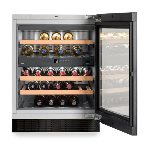 Встраиваемый винный шкаф Liebherr UWTgb 1682 создаст оптимальные условия для хранения алкогольных напитков. Он не занимает много места и отлично сочетается со всеми видами кухонных гарнитуров. Устройство прекрасно выглядит и станет настоящим украшением интерьера. Управление электронное. На сенсорном дисплее отображается температура в винном отсеке. Панель можно заблокировать от детей. Малыши не смогут изменить настройки. Если вы неплотно закроете дверцу, звуковой сигнал напомнит вам об этом. Дверца выполнена из тонированного стеклопакета. Она надежно защищает содержимое от воздействия ультрафиолета. Встраиваемый винный шкаф Либхер UWTgb 1682 рассчитан на 34 стандартные бутылки. В нем имеются две температурные зоны. Вы можете хранить внутри красное и белое вино, настроив для каждой группы напитков свои параметры. Дверцу легко перевесить на другую сторону. Устройство можно расположить в любом удобном месте. Створка оснащена доводчиком и легко закрывается. Ножки регулируются по высоте. Изделие устойчиво располагается на разных напольных покрытиях. В рабочей камере используется циркуляционное охлаждение. Воздух постоянно перемещается внутри. В результате все бутылки охлаждаются равномерно. Полки выполнены из натурального дерева. Устройством приятно и комфортно пользоваться. Три из пяти полок выдвигаются на телескопических направляющих. Модель относится к климатическому классу SN-ST, ее можно устанавливать в помещениях с температурой от +10°C. Внутри имеется светодиодная подсветка, яркость которой плавно увеличивается. Специальный фильтр с активированным углем очищает воздух и препятствует появлению неприятных запахов. Устройство крайне экономно расходует электроэнергию и относится к классу энергоэффективности А. Ключевые преимущества: * Две температурные зоны * Перенавешиваемая дверца * Циркуляционное охлаждение