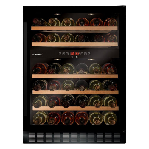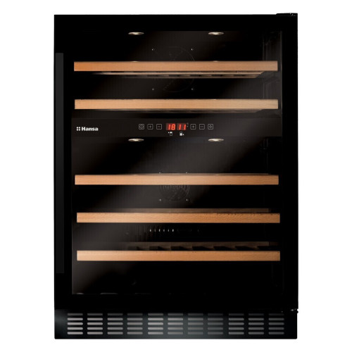 Винный шкаф Hansa FWC60452B выполнен в черном цвете, его корпус и дверцы выполнены из металла, а полки из дерева. Общая вместимость бутылок составляет 45 шт, а кол-во полок 5. Он имеет компрессорный тип охлаждения с двумя температурными зонами, чей диапазон составляет от 5 до 20 градусов. Используемый хладагент - R600A, а климатический класс - ST. Винный шкаф имеет класс энергопотребления - B, и потребляет до 0.493 кВт/ч.