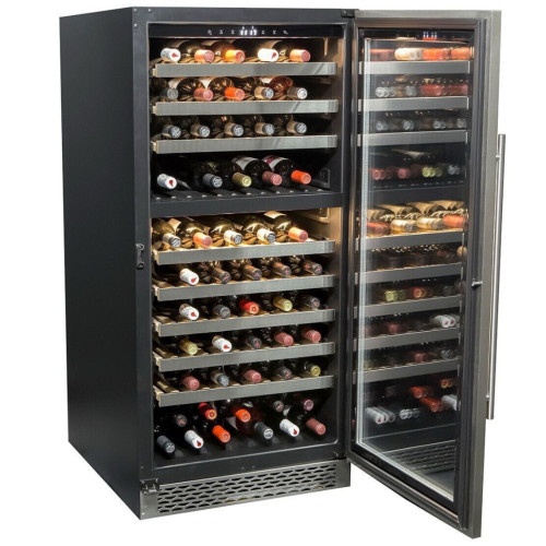 Винный шкаф Cavanova CV120DT оборудован компрессорной системой охлаждения, за счет чего значительно снижено потребление электроэнергии и расширен диапазон поддерживаемых температур. Встраиваемый шкаф в любую нишу, также возможно использовать как отдельно стоящий. Данная модель оснащена выдвижными деревянными полками, что облегчает доступ к бутылкам. Рассчитан на хранение до 102 бутылок типа бордо. Дверца шкафа выполнена из тонированного стекла с защитой от УФ лучей в рамке серебрянного цвета. Регулируемый температурный режим в каждой камере от +5°C до +20°C позволяет хранить белые, красные вина раздельно. Удобная сенсорная панель управления и циферблат расположены внутри за дверцей шкафа.