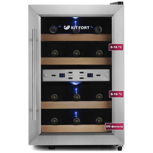 Винный шкаф Kitfort КТ-2404 имеет 2 температурные зоны, в каждой из которых возможно выставить индивидуальный температурный режим хранения. В винном шкафу имеются 4 деревянные полки для укладки бутылок. Рабочий температурный диапазон винного шкафа выставляется в пределах от 8 °С до 18 °С, температура настраивается с шагом в 1 °С.