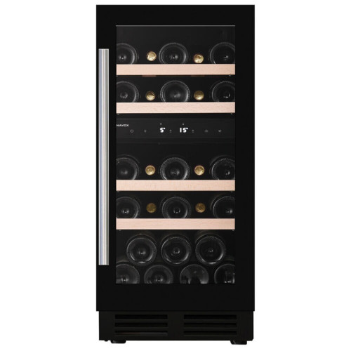 Компрессорный винный шкаф Dunavox DAUF-32.78DB Инженеры компании Dunavox разработали новую модель встраиваемого винного шкафа DAUF-32.78DB. Установить его можно под столешницу Вашего мебельного гарнитура. Ножки регулируются под нужную высоту. Модель идеально вписывается в любой подходящий для Вас интерьер гостиной кухни, бара или кабинета. В качестве дополнительной функции, производители Dunavox разработали реверсивную дверь. Это поможет разместить шкаф в удобном для Вас месте или расположить две модели рядом, создав технологию открытия side-by-side. Двойное стекло с защитой от прямых УФ-лучей поддерживает качественные условия хранения вина. Встроенная система вентиляции создаёт необходимую циркуляцию воздуха для правильной работы винного холодильника Компрессорный винный шкаф Dunavox DAUF-32.78DB обладает средней вместимостью и способен разместить в себе до 32 бутылок. Располагаются они на выдвижных полках из массива бука. Внутреннее пространство шкафа разделено на 2 температурные зоны с возможностью настраивать каждую из них. Верхнюю в диапазоне от +10°C до +18°C, нижнюю от +5°C до +10°C . Электронный термостат помогает стабильно поддерживать заданную Вами температуру. Холодильник поддерживает влажность в диапазоне 60-80%, как в настоящем винном погребе. Для дополнительного повышения влажности предусмотрен контейнер для дистиллированной воды. Наличие «Зимнего режима» даёт возможность повысить температуру внутри шкафа, если температура в помещении упала ниже установленной для хранения вина. Угольный фильтр очищает воздух и предотвращает появление посторонних запахов, которые могут испортить вкус напитка. Лаконичный дизайн шкафа придаёт интерьеру современный вид. Чёрный корпус и рамка добавляют элегантности и солидности. В этой модели использовано освещение синего цвета, которое обеспечивает равномерную подсветку всех полок. (Освещение плавно включается при открывании дверцы, а через пару секунд после закрытия плавно гаснет.) Дополнительно у данной модели шкафа предусмотрен демонстрационный режим, во время которого освещение не гаснет. Такая функция помогает демонстрировать винную коллекцию Вашим друзьям и близким. Удобное и понятное сенсорное управление, исключает вероятность случайного нажатия. Если Вы забыли или не до конца закрыли шкаф – сигнализатор двери оповестит об этом. Винный шкаф DAUF-32.78DB – современное решение в вопросе хранения вин. Отличительные особенности: * Две температурные зоны * Элегантный дизайн * Перенавешиваемая дверь * Сигнализатор открытой двери * Затемненное стекло с УФ-фильтром * Светодиодное освещение * Плавное включение и выключение освещения * Зимний режим * Класс энергоэффективности G * Встроенный угольный фильтр * Сенсорное управление * Встроенная система вентиляции * Регулируемые ножки * Вентилируемые зоны