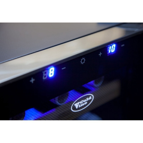 Две температурные зоны позволяют хранить в шкафе одновременно как и белые вина, так и красные. А также на деревянных полках легко помещаются бутылки шампанского. При необходимости можно вытащить одну из полок,и расположить более объемные бутылки. Корпус винного шкафа выполнен из стали, окрашенной в чёрный цвет. Стекло двери также затемнённое с шелкографией. По периметру дверцы идёт тонкая рама из стали, что придаёт элегантности и стиля винному шкафу Сold Vine C12-TBF2. Сенсорная панель управления находится на дверце шкафа, что облегчает доступ к установке желаемой температуры в каждой из зон, и даёт возможность включить мягкую светодиодную подсветку голубого цвета для демонстрации коллекции. В каждой из зон можно установить температуру в диапазоне от +7 до +18 ˚С, поэтому в шкафе можно хранить несколько видов вина одновременно. Вместимость винного холодильника составляет 12 бутылок типа Бордо емкостью 0,75 л. Не стоит забывать, что термоэлектрические шкафы не любят тепла и замкнутых пространств, поэтому рекомендуем устанавливать их в прохладном месте, вдали от солнечных лучей и других источников тепла, не закрывая при этом вентиляционных отверстий на корпусе шкафа. Небольшой и вместительный, двухзонный винный шкаф Cold Vine C12-TBF2 будет служить Вам верным помощником и сохранит прохладными Ваши любимые напитки.