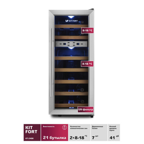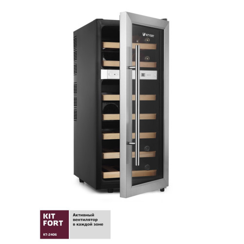 Винный шкаф Kitfort KT-2406 состоит из двух камер, в каждой из которых возможно выставить индивидуальный температурный режим хранения. В верхнюю камеру помещается 6 бутылок, в нижнюю — 15 бутылок. Охлаждение производится при помощи термоэлементов Пельтье, поэтому в винном шкафу не используется никаких вредных хладагентов, а уровень шума меньше, чем у компрессорных холодильников, и отсутствуют вибрации. Рабочий температурный диапазон винного шкафа выставляется в пределах от 7 °С до 18 °С для верхней камеры, и от 10 °С до 18 °С для нижней камеры; температура настраивается с шагом в 1 °С.