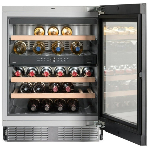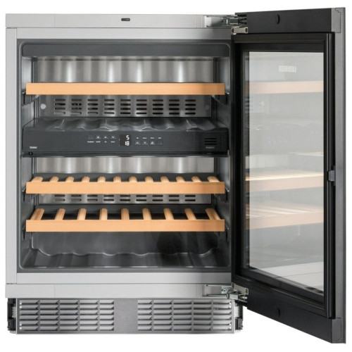 Встраиваемый под столешницу винный темперирующий шкаф. Общие данные: Размеры: Высота: 81.6-86.6 см Ширина: 59.7 см Глубина: 57.1 см Общий объем: 123 л Полезный объем: 94 л Максимальное количество бутылок: 34 Тип управления: электронный Климатический класс: SN-ST (от +10°С до +38°С) Класс энергопотребления: А Годовое потребление энергии: 144 кВтч/год Цвет: черный Температура: от +5°C до +20°C Винное отделение: Циркуляционное охлаждение Освещение: Светодиодное продолжительно включаемое (плавное изменение яркости) Количество полок: 5, из них 3 выдвигающиеся на телескопических шинах Материал полок: натуральное дерево Фильтр из активированного угля Дополнительная информация: Управление: на ЖК-дисплее Управление: сенсорное Индикатор температуры Сигнализация неисправности: oптическая и акустическая Сигнализация неплотно закрытой двери: акустическая Защита от детей Уровень шума: 36 дБ Дверной доводчик SoftSystem Монтаж двери: не требуется Сторона открывания двери: правая, перенавешиваемая Регулируемые по высоте ножки: 4