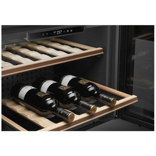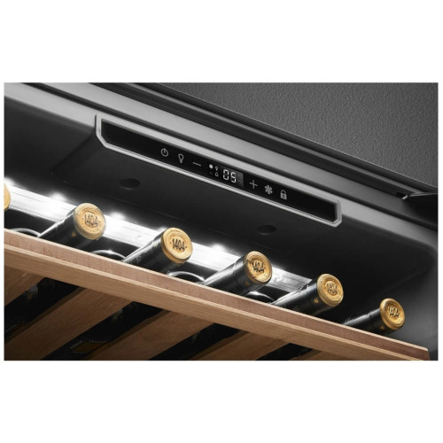 Основные характеристики Тип: климатический шкаф Тип установки: встраиваемый Тип компрессора: стандартный Количество компрессоров: 1 Количество отделений: 1 Общий полезный объем: 46 л Максимальное количество бутылок: 21 Назначение винного шкафа: для длительного хранения, для подготовки вина к подаче Охлаждение Тип системы охлаждения: компрессорная Система охлаждения: динамическая Климатические класс: SN-N-ST Управление Тип управления: электронное Способ управления: сенсорный Расположение панели управления: в камере Дисплей Цифровой дисплей: да Тип дисплея: LED Температурные режимы Количество температурных зон: 1 Температура хранения: 5-20 °C Отделения Количество полок: 3 Тип полок: выдвижные, фиксированные Выдвижные полки: да Индикация Индикация температуры: да Индикация включения: да Индикация повышения температуры: звуковая Индикация открытой двери: звуковая Электропитание Класс энергопотребления: F Энергопотребление: 100 кВтч/год Напряжение: 220-240 B Мощность подключения: 40 Вт Уровень шума: 36 дБ Длина сетевого шнура: 1.5 м Защита и безопасность Тип сигнализации: акустический Сигнализация об открытой двери: да Сигнализация о повышении температуры: да Защита от детей: да Освещение Тип освещения: светодиодное (LED) Особенности конструкции Количество дверей: 1 Тип двери: прозрачная Открытие дверцы: направо Перенавешиваемые двери: да Тонированное стекло на двери: да Дверь с двойным стеклом: да Угольный фильтр: да Встроенный вентилятор для распределения температуры: да Покрытие Защитное покрытие от отпечатков пальцев: да Цвет и материал Цвет: нержавеющая сталь Цвет полок: бежевый Материал двери: стекло Материал боковых стенок: окрашенный металл Материал полок: дерево Комплектация Инструкция: да Размеры и вес Высота: 45.65 см Ширина: 59.6 см Глубина: 55.42 см Высота встраивания: 45 см Ширина встраивания: 56-57 см Глубина встраивания: 55 см