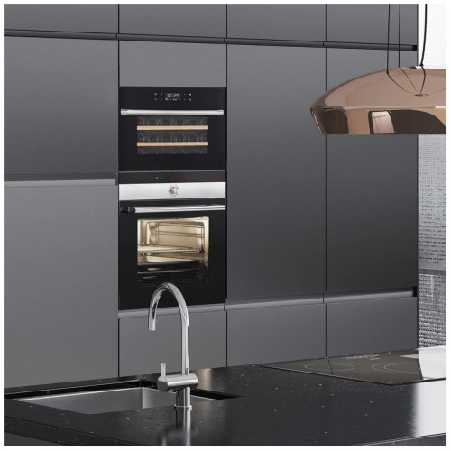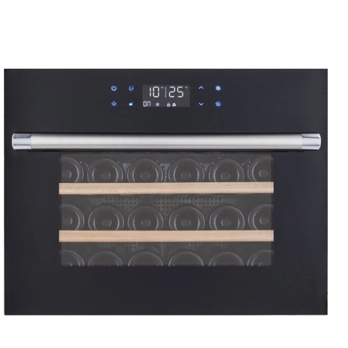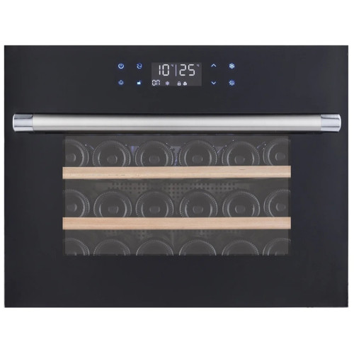 Основные характеристики - Тип: климатический шкаф - Тип установки: встраиваемый - Тип компрессора: стандартный - Количество компрессоров: 1 - Количество отделений: 1 - Общий полезный объем: 55 л - Максимальное количество бутылок: 24 - Назначение винного шкафа: для длительного хранения Охлаждение - Тип системы охлаждения: компрессорная - Хладагент: R600a (изобутан) - Климатические класс: N Управление - Тип управления: электронное - Способ управления: сенсорный - Расположение панели управления: на дверце Дисплей - Цифровой дисплей: да Температурные режимы - Количество температурных зон: 1 - Температура хранения: 5-20 °C Отделения - Количество полок: 3 - Тип полок: выдвижные Индикация - Индикация температуры: да - Индикация включения: да - Индикация режима работы: да - Индикация отключения электропитания: визуальная - Индикация повышения температуры: визуальная Электропитание - Класс энергопотребления: A - Энергопотребление: 96 кВтч/год - Напряжение: 220-240 B - Мощность подключения: 80 Вт - Уровень шума: 34 дБ Защита и безопасность - Защита от детей: да Освещение - Тип освещения: светодиодное (LED) Функции и возможности - Дополнительная информация: стекло с УФ-фильтром Особенности конструкции - Количество дверей: 1 - Тип двери: прозрачная - Открытие дверцы: направо - Угольный фильтр: да - Встроенный вентилятор для распределения температуры: да Цвет и материал - Цвет: чёрный - Цвет ручек: серебристый - Цвет полок: бежевый - Материал двери: стекло - Материал полок: дерево - Материал ручек: металл Комплектация - Инструкция: да Размеры и вес - Высота: 45.5 см - Ширина: 59 см - Глубина: 56.6 см - Высота встраивания: 46 см - Ширина встраивания: 56 см - Глубина встраивания: 60 см - Вес: 27.5 кг