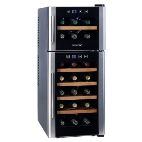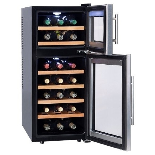 Cellar Private CP021-2E это двух камерный холодильник для вина, вместимостью до 21 бутылку. Температура выставляется в каждой камере раздельно, что позволяет хранить одновременно красные и белые вина. Температура в верхней камере 7 - 18°С / в нижней камере 10-18°С Сенсорные кнопки управления температурой и подсветкой, расположены прямо на стеклянной дверце. В отличие от обычного бытового холодильника в CP021-2E полностью исключена вибрация, это является обязательным условием для хранения вин. Стекло тонировано специальным покрытием, предотвращающим попадание внутрь камеры УФ лучей, которые негативно влияют на качество вина. При помощи вентиляторов установленных внутри каждой камеры обеспечивается постоянное проветривание бутылок, это предотвращает появление посторонних запахов и образование плесени. Cellar Private CP021-2E оснащен деревянными съемными полками.
