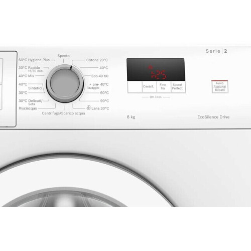 Стиральная машина Bosch оснащена эффективным и долговечным двигателем EcoSilence Drive, который работает значительно тише, чем обычные моторы. Он мягко и без рывков вращает барабан, обеспечивают бережную стирку. Специальная конструкция боковых стенок прибора AntiVibration увеличивает жесткость корпуса, что ведёт к снижению вибрации. Уменьшение вибрации делает прибор стабильным и тихим в процессе работы, а также продлевает срок эксплуатации всей машины. Функция SpeedPerfect экономит время стирки без потери ее качества. Серия Serie 2 — простая, удобная и надежная в пользовании техника. Чаще всего выполнена в небольших размерах. Управление доступное для любого человека. Технологии в ней только проверенные временем, без особо сложного функционала. Но в этих приборах есть все необходимое для качественной работы. По цене — это самая демократичная техника. SpeedPerfect позволит вам ускорить ритм своей жизни и сделать ее комфортнее. Если вам необходимо получить чистое белье в кратчайшие сроки, то эта опция станет вашим надежным помощником. Она сокращает время выполнения программы на 65%, обеспечивает быструю и эффективную стирку без ущерба для качества. Так вы сможете получить результат вдвойне быстрее, чтобы у вас было больше времени на действительно важные вещи. Инверторный двигатель EcoSilenceDrive — сердце стиральных машин, бьющееся в ритме инноваций и эффективности. Он сочетает в себе практичность и надежность, обеспечивая бесшумную и плавную работу при любой скорости вращения. Благодаря ему, стиральная машина обеспечивает идеальный баланс, минимизируя вибрации и шум. Это обеспечивает высокую эффективность стирки, долгий срок службы и экономию энергии. Ключевые особенности: * Двигатель EcoSilence Drive * Дизайн AntiVibration * Функция SpeedPerfect