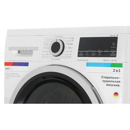 Стирально-сушильная машина Bosch Serie 4 отличается функциональностью и удобством в использовании. Она вмещает до 8 кг в режиме стирки и до 5 кг в режиме сушки. Модель предлагает 16 автоматических программ для ежедневной стирки и сушки различных вещей. Функция «Обработка паром» позволяет освежить ткани, устранить складки и неприятные запахи. Благодаря скорости отжима до 1400 об/мин достигается эффективное устранение влаги в вещах. На панели управления расположены сенсорный дисплей и поворотный переключатель. Система автоматического взвешивания способствует экономичному расходу ресурсов. Для повышения комфорта в эксплуатации Bosch Serie 4 реализованы звуковой сигнал и защита от перепадов напряжения в электросети.