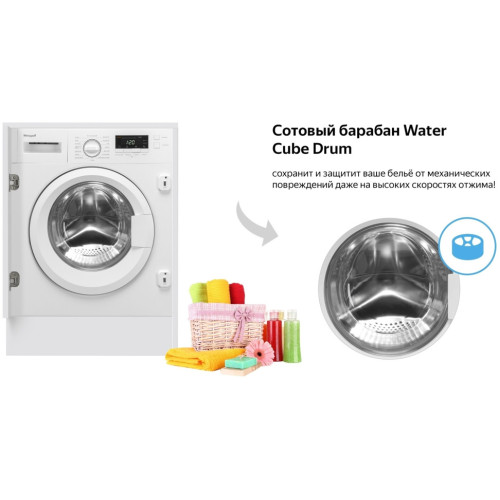 Стиральная машина Weissgauff вмещает до 8 кг белья и обеспечивает скорость отжима до 1200 оборотов в минуту. Оптимальная вместимость позволяет машине справиться со всем объёмом одежды за один цикл. Скорость отжима до 1200 оборотов в минуту существенно сокращает время дальнейшей сушки белья. Сотовый барабан Water Cube Drum защитит бельё от механических повреждений даже на высоких скоростях отжима. Режим «Быстрая стирка» на 15 минут отлично подходит для тех, у кого на счету каждая минута. Режим для детских вещей добавляет дополнительное полоскание, эффективно удаляя остатки моющего средства. Режим для изделий из шерсти и кашемира позволяет выполнить эффективную стирку, сохраняя при этом качество и структуру ткани. Функция «Моя программа» позволит сохранить в памяти машины новый режим работы с бельём, созданный на основе индивидуально выбранных параметров. Таймер отложенного старта позволяет отстрочить стирку до 24 часов. Функция дозагрузки белья после запуска программы обеспечивает дополнительное удобство. Блокировка от детей защитит стиральную машину от нарушения работы программы из-за непреднамеренных нажатий кнопок или поворотов переключателя. Полностью электронное управление позволит в одно касание выбрать любую из 16 программ, а удобный цифровой дисплей выведет всю необходимую информацию. По окончании хода программы раздастся звуковой сигнал. Полная защита от протечек реализована благодаря технологии AquaStop в шланге и дополнительной системе безопасности в корпусе стиральной машины.