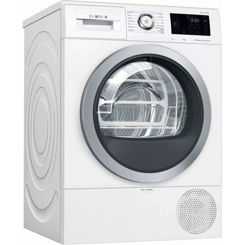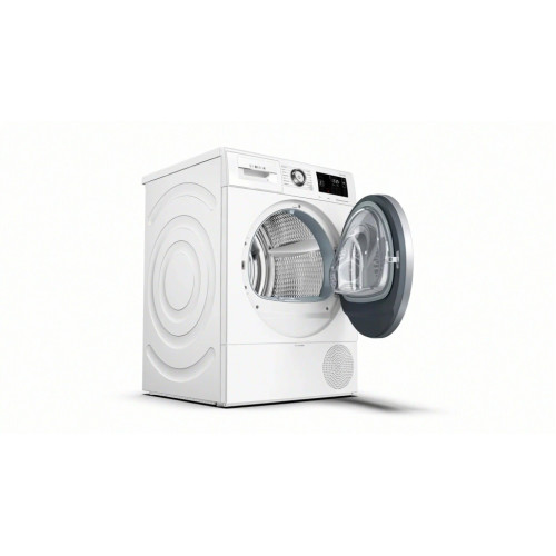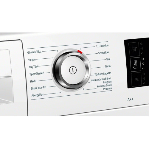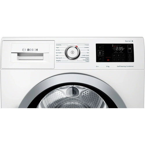 Сушильная машина Bosch рассчитана на 9 кг белья. В эту модель заложено множество программ, среди них циклы, предназначенные для разных видов тканей (хлопок, синтетика) и типов изделий. Уровень остаточной влажности можно регулировать, выбирая «В шкаф» или «Под утюг».  Управление производится при помощи поворотного переключателя и сенсорной панели, оснащенной дисплеем. Он отображает все параметры работы, включая этапы выполнения программы и время, оставшееся до ее окончания. Есть возможность заблокировать управление, чтобы случайно не смогли изменить настройки.