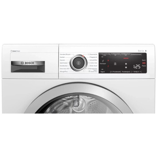 Сушильная машина Bosch – распределяйте свое время и пространство в квартире наиболее удобно! С появлением в доме этого устройства, вам больше не придется тратить время на развешивание белья на веревке или сушилке – теперь это не ваша забота. Сушильная машина бережно высушит ваши вещи, сохранив форму каждого изделия, и подарит безупречный результат сушки. Машинка рассчитана на загрузку 8 кг белья и характеризуется низким уровнем энергопотребления. Bosch оснащена интуитивно понятным управлением. Выбирать автоматическую программу, настраивать режимы работы, и подбирать иные параметры вы сможете при помощи поворотного регулятора и сенсорных кнопок. На большом дисплее будет отображена информация о текущей работе прибора, включая выбранный режим и время, оставшееся до завершения программы. В устройстве предусмотрено 14 автоматических программ работы, рассчитанных на разные типы ткани. Среди заданных режимов вы найдете программы для сушки синтетики, шелка, спортивных изделий, хлопка, одеял и т.д. Такое разнообразие программ позволит подобрать наиболее подходящий режим для любого изделия. Сушильная машина Bosch оснащена функцией отложенного старта, что позволит отложить запуск программы сушки, а блокировка панели управления от детей не даст малышам сбросить заданные параметры стирки или включить устройство без вашего ведома.