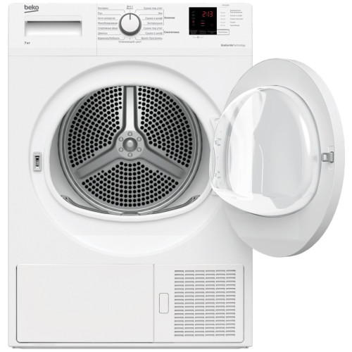 Основные характеристики - Установка: отдельностоящая - Тип загрузки: фронтальная - Максимальная загрузка белья: 7 кг - Вид сушки: конденсационный с тепловым насосом Управление - Тип управления: электронное - Переключатели: кнопочные, поворотные - Размещение панели управления: под наклоном - Тип сушки: по таймеру, по степени влажности - Количество программ: 15 - Программы: хлопок "Сушка под утюг", хлопок "Эко", хлопок "Сушка в шкаф", хлопок "Экстрасушка", синтетика "Сушка под утюг", синтетика "Сушка в шкаф", время программы (от 10 до 160 минут), освежающий цикл, бережная/рубашки, джинсы, спортивные вещи, микс/ежедневная, анти-аллергия, пух, экспресс - Разглаживание складок: да Дисплей - Цифровой дисплей: да - Тип дисплея: LED Таймер - Таймер отсрочки: да - Максимальное время отсрочки: 24 ч - Звуковой таймер: да Индикация - Звуковой сигнал завершения программы: да - Отключение звукового сигнала: да - Индикация времени до конца программы: да - Индикация заполнения резервуара: да - Индикация загрязнения фильтра: да - Индикация этапов программы: да Технологии - Технология Heat Pump: да - Датчик влажности: да Защита и безопасность - Защита от детей: да - Ворсовый фильтр: да Энергопотребление - Класс энергопотребления: A+ - Энергопотребление за цикл: 2.29 кВт/ч - Напряжение: 230-240 В - Длина сетевого шнура: 1.5 м Особенности конструкции - Поверхность барабана: соты - Реверсивное вращение барабана: да - Подсветка барабана: да - Форма дверцы: круглая - Направление открывания дверцы: вправо - Угол открывания дверцы: 155 ° - Регулируемые ножки: да Дополнительные функции - Охлаждение после сушки: да - Возможность подключения к сливу: да Цвет и материал - Цвет дверцы люка: белый - Цвет: белый Комплектация - Инструкция: да Размеры и вес - Высота: 84.6 см - Ширина: 59.7 см - Глубина: 50.8 см - Вес: 42 кг
