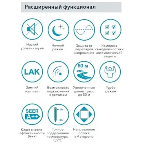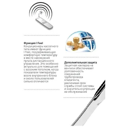 Кассетные внутренние блоки EACC FMI/N3 созданы с использованием технологии DC инвертор, что позволяет им практически бесшумно работать на низких частотах и максимально точное поддерживать температуру, а также успешно функционировать, даже если за окном -15°С. Надёжность и долговечность кассетных внутренних блоков EACC FMI/N3 во многом обеспечивается их устойчивостью к перепадам напряжения и высоким уровнем защиты от нештатных ситуаций. Встроенная система самодиагностики анализирует основные параметры кондиционера и в случае необходимости блокирует его работу, информируя владельца сплит-системы о возникшей проблеме с помощью звукового сигнала и индикатора. Отличительная особенность – в данном типе техники нет необходимости использования распределительных узлов, внутренние блоки можно подключить к наружному блоку.
