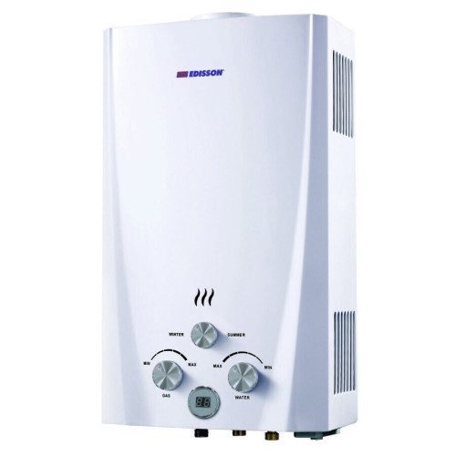 Edisson — это универсальный газовый нагреватель воды, который является наилучшей альтернативой бойлера. С помощью данной модели вы сможете нагревать до 10 литров воды в минуту при максимальной температуре в 65 градусов. Таким образом, в кране всегда будет горячая вода. Температуру можно регулировать с помощью специальных датчиков. Водонагреватель имеет классический дизайн, который отлично впишется в интерьер любой кухни или ванной. Данное устройство удобно в использовании.
