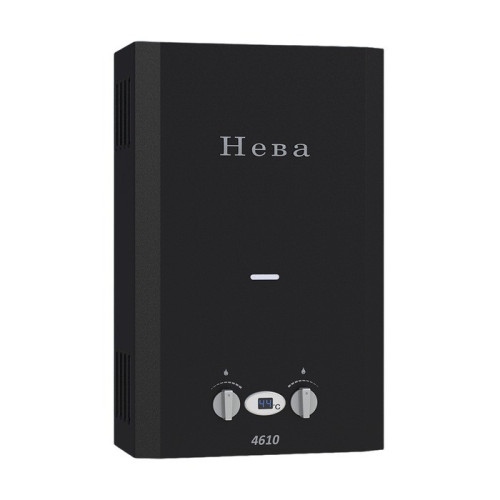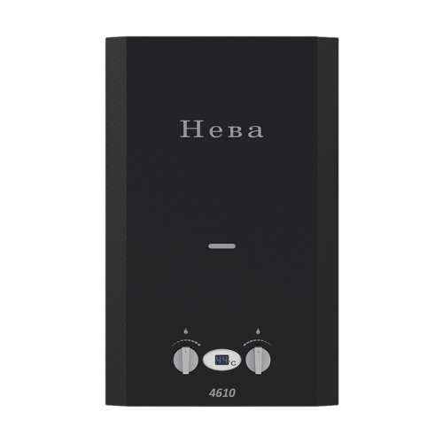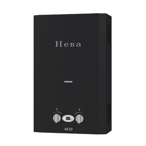 Аппарат водонагревательный проточный бытовой NEVA (Нева) 4610 матовый чёрный имеет медный теплообменник, который обладает высокой теплопроводностью и мало подвержен низкотемпературной коррозии. Отличительной особенностью является лаконичный классический дизайн облицовки с механическим управлением двумя ручками регулировки. Особенности и преимущества: * Электронное зажигание от батареек * Одна точка водоразбора * Устойчивая работа при низком давлении воды * Современная автоматика безопасности: 6 степей безопасности * Датчик перегрева * Датчик обратной тяги, отключение водонагревателя при перекрытии дымохода * Ионизационный электрод для контроля наличия пламени * Электромагнитных клапан для перекрытия подачи газа в случае нештатных ситуаций * Датчик протока для перекрытия подачи газа в случае отсутствия протока воды * Предохранительный клапан, который срабатывает при превышении давления воды выше 13 бар * Жидкокристаллический дисплей с выводом информации о текущей температуре воды Для обеспечения горячей водой квартир и загородных домов используются газовые проточные водонагреватели российской компании «Neva». Высококачественные и простые в обслуживании, модели, оснащены полным набором систем безопасности и электроподжигом. Компактные приборы специально разработаны для эксплуатации на территории России и надежно работают даже при низком напоре воды.