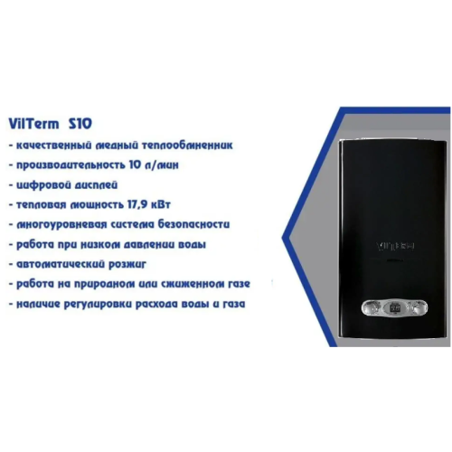 Газовый проточный водонагреватель VilTerm (ВилТерм) S10 (ЧЕРНАЯ) ориентирована на получение горячей воды в жилых помещениях. Прибор имеет многоуровневую систему защиты, которая гарантирует надежность и безопасность эксплуатации. В нижней части корпуса установлен ЖК-дисплей, ручки регулировки мощности и напора воды, окошко слежения за пламенем. Особенности: * Латунный водяной узел. * Медные теплообменник и трубы, обеспечивающие эффективный и быстрый нагрев воды. *  Многоступенчатая система безопасности. В случае отсутствия пламени, газа или тяги в дымоходе, а также при перегреве воды оборудование автоматически отключается. * Стабильность в работе даже при слабом напоре воды. * Производительность 10 литров горячей воды в минуту. * Легкость и безопасность эксплуатации. Для того чтобы получить горячую воду потребуется всего лишь открыть кран с водой. Розжиг происходит автоматически. * Ремонтопригодность, недорогие запчасти. Газовые проточные водонагреватели VilTerm серии S – это компактное оборудование отечественного производства, способное обеспечить пользователей горячей водой. Линейка представлена множеством моделей, которые отличаются не только производительностью, но и внешним оформлением, а также цветовой гаммой.