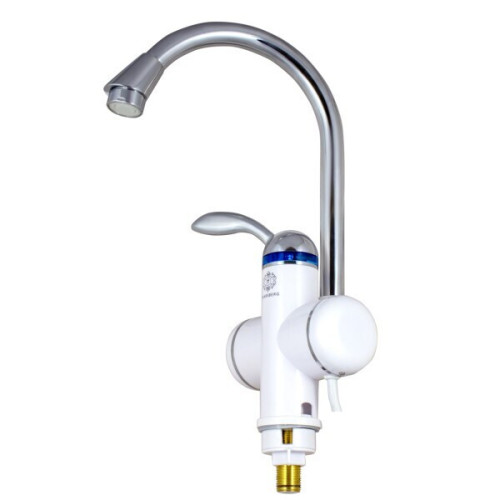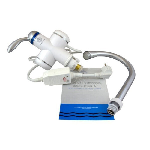 Водонагреватель проточного типа быстро нагреет воду, благодаря компактному размеру устанавливается над раковиной в кухне. В комплект входит кухонный кран. Водонагреватель имеет три режима нагрева, безопасен при работе. Отличное решение на периоды отключения горячей воды или в качестве постоянного источника теплой воды в помещениях где отсутствует постоянное горячее водоснабжение. Это компактный и простой в управлении прибор, который устанавливается на кухне или в ванной комнате. Проточные водонагреватели абсолютно безопасны: датчик перегрева отключит прибор в случае нештатной ситуации, а корпус выполнен из термостойкого пожаробезопасного пластика. Нагревательный элемент изготовлен из меди. Безнапорный водонагреватель проточного типа имеет три режима работы, которые без труда переключаются регулятором. Максимальная температура нагрева, °C95. Максимальная температура воды на выходе, ℃55. Материал нагревательного элемента медный. Преимущества: * Для одной точки водоразбора * Медный нагревательный элемент в термостойкой колбе * Двойной защитный механизм от перегрева и включения всухую * Класс защиты IPX4 - корпус защищен от проникновения прямой струи воды * Три режима работы * Класс защиты от поражения током - I