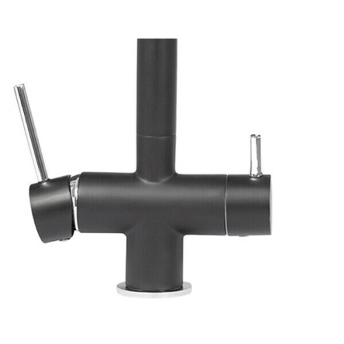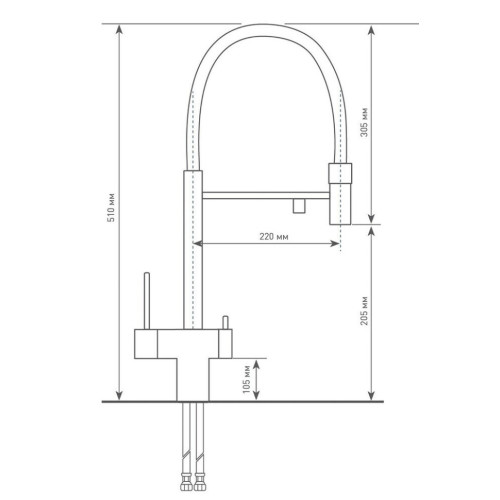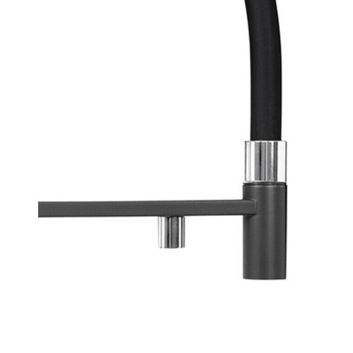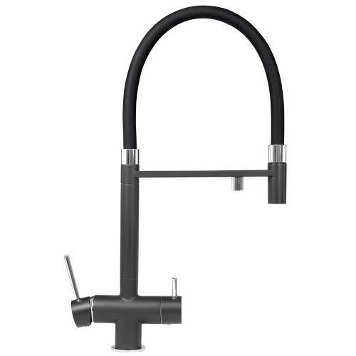 Смеситель с душем и подключением фильтрованной воды. Одноизливный – фильтрованная и водопроводная вода подаются через один аэратор. Это позволяет не нарушая общего вида смесителя, получать очищенную и водопроводную воду через одно устройство. Гибкий излив смесителя выполнен из армированного ПВХ и имеет длину 100 см. Корпус смесителя выполнен из латуни.