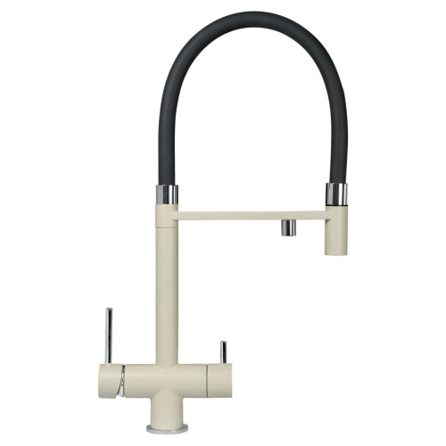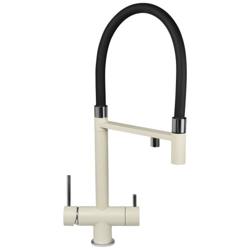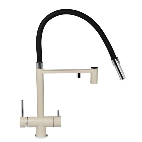 Смеситель с душем и подключением фильтрованной воды. Одноизливный – фильтрованная и водопроводная вода подаются через один аэратор. Это позволяет не нарушая общего вида смесителя, получать очищенную и водопроводную воду через одно устройство. Гибкий излив смесителя выполнен из армированного ПВХ и имеет длину 100 см. Корпус смесителя выполнен из латуни.