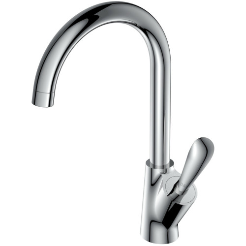 Смеситель для кухни D&K выполнен из латуни в цвете хром. Излив смесителя поворотный. Монтаж производится на поверхность с одним отверстием. Управление смесителем рычажное.