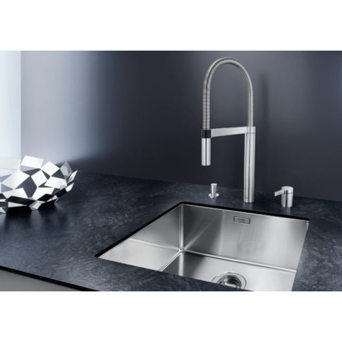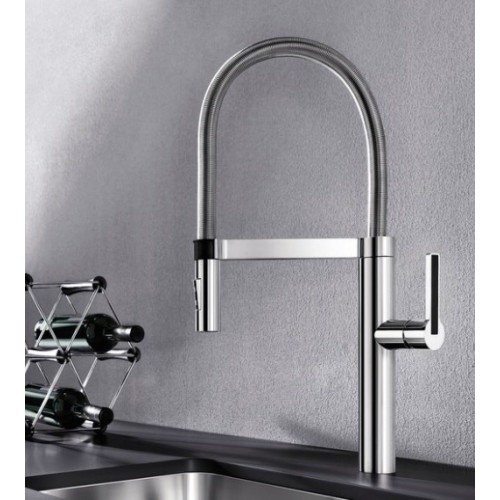 Blanco Culina-S - смеситель с пружиной из нержавеющей стали, которая обеспечивает свободу движения. Модель с удобной фиксацией шланга при помощи магнитного держателя. Уменьшенный размер позволяет установить прибор под навесными ящиками. Запатентованный рассекатель позволяет уменьшить образование налета от воды. Оснащен керамическим дисковым картриджем и обратными клапанами, которые предотвращают возврат воды. Благодаря гибкому шлангу можно с легкостью мыть посуду в труднодоступным местах. Рычаг управления обеспечивает простое регулирование температуры и напора воды.