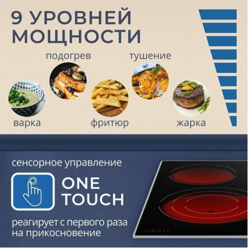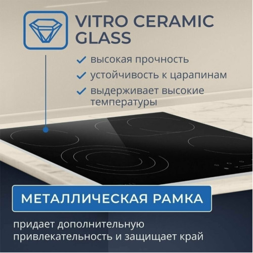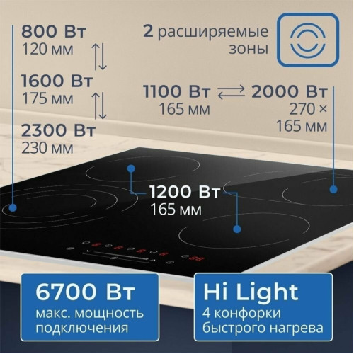 Варочная панель ZUGEL ZEH603FB, исполненная в стеклокерамике Vitro Ceramic Glass - это идеальное сочетание недорогой цены и расширенных возможностей в одной модели. • Сенсорное управление One Touch, современное и оперативно реагирующее на ваши прикосновения с первого раза; • Металлическая рамка придает Вашей поверхности дополнительную привлекательность; • Блок управления-слайдер, позволяющий всего в одно касание выставить необходимый вам уровень нагрева любой из конфорок и делающий процесс управления панелью значительно более быстрым и легким; • 9 уровней мощности - с ними вы сможете подобрать подходящую температуру для приготовления практически любого блюда; • Таймер дает вам возможность запрограммировать время выключения любой конфорки, с точностью до минуты; • Максимальная мощность подключения 6700 Вт - делает данную модель по-настоящему мощной, позволяя вам готовить на всех четырех конфорках одновременно, без потерь эффективности каждой рабочей зоны; • Благодаря имеющейся тройной зоне расширения Вы можете выбирать мощность и диаметр нагреваемой поверхности конфорки, так же имеющаяся овальная зона расширения позволит без проблем готовить в нестандартной посуде; • Защитное автоотключение - это дополнительный уровень безопасности, который гарантирует высокую степень защиты для вас и вашего дома, обеспечивая самостоятельное отключение конфорки; • Индикация остаточного тепла, сообщающая вам о том, когда прикасаться к конфорке уже безопасно, а когда - еще нет, ведь в течение некоторого времени после выключения, поверхность варочной панели все еще может оставаться горячей; • Блокировка от детей, благодаря которой вы всегда сможете избежать ненужных нажатий на элементы управления, например, во время уборки варочной панели или, чтобы предотвратить её незапланированное включение детьми.