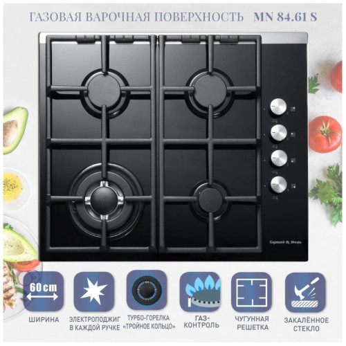 В варочной поверхности типа "газ на стекле" Zigmund & Shtain MN 84.61 S все соответствует последним тенденциям моды и качества. Данная модель оснащена системой электроподжига в каждой ручке, потому вы можете забыть обо всех неудобствах, которые связаны с использованием зажигалок и спичек. Как и вся продукция компании, газовая поверхность MN 84.61 S разработана с пресловутой немецкой педантичностью и с учетом не только практичности и комфорта ее использования, но и безоговорочной безопасности: в данном случае речь идет о системе газ-контроль, которая в автоматическом режиме прекращает подачу газа, если пламя гаснет.