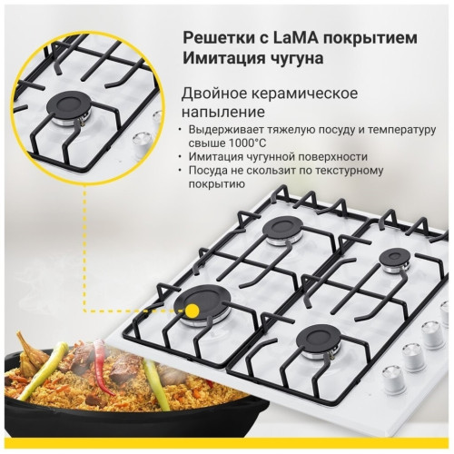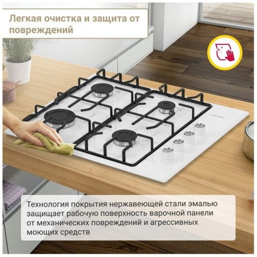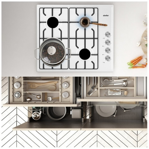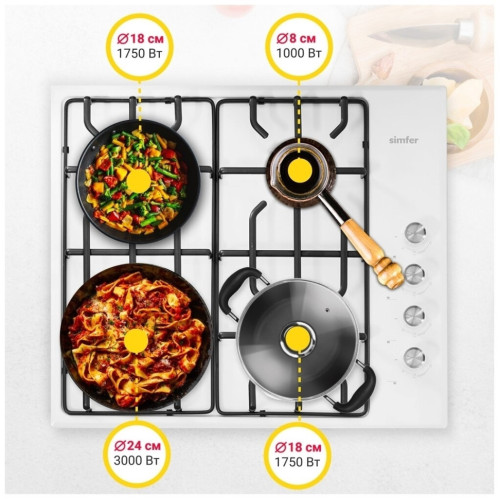 Газовая варочная панель Simfer H60Q40-570 - модель, которая благодаря своим компактным размерам органично впишется в интерьер вашей кухни и сделает ежедневный процесс приготовления еды комфортным. В качестве материала для изготовления варочной поверхности использовалась эмалированная сталь, которая в разы упрощает утомительный процесс ухода за ним и делает процесс очистки лёгким и удобным. На ней располагаются четыре конфорки - разные по диаметру и мощности пламени в них. А значит вы сможете выбрать оптимальную конфорку для приготовления разнообразных блюд. В поворотные переключатели встроен электроподжиг, который значительно упрощает работу с панелью, а система газ-контроля предотвращает возможность случайной утечки газа в случае угасания пламени.