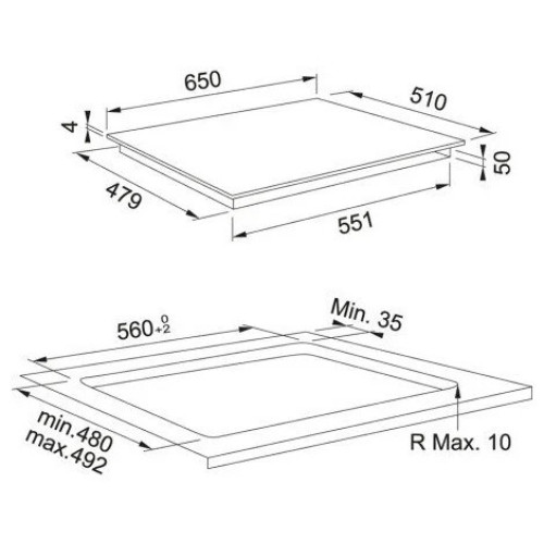 Черное стекло, Прямые края, Установка сверху или вровень со столешницей, размеры И мощность ЗОН нагрева передняя левая ? 145 мм 1,20 кВт задняя левая ? 210 мм 2,10 кВт задняя правая ? 145 мм 1,20 кВт передняя правая ? 180 мм 1,80 кВт, суммарная мощность подключения 7,20 кВт, габариты 650 x 510 мм, вырез 560 x 492 мм (при монтаже сверху) 653 x 513 мм, R 6,5 мм (при монтаже вровень со столешницей), 4 индукционные зоны нагрева, Сенсорное управление, 9-ступеней мощности, Функция BOOSTER, Функция помощник повара, Функция медленное кипение, Функция автоматики закипания, Функция растапливания, Функция подогрева блюда, Индикация остаточного тепла, Защита от перегрева, Блокировка управления, Таймер отключения, Возможность подключения к сети 230V / 400V, Выбор с ограничением максимальной потребляемой мощности (2,5 кВт — 4,0 кВт — 6,0 кВт — 7,2 кВт)
