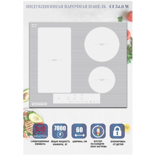 Бренд:ZIGMUND&SHTAIN, Тип Варочной Панели:Независимая/Индукционная, Количество Конфорок:4, Управление:Сенсорное, Расширенная Зона Нагрева:Нет, Индикатор Ост. Тепла:Да, Таймер:Да, Мощность Подключения, Квт:7,0, Материал Рабочей Поверхности:Стеклокерамика, Цвет Панели:Белый, Цвет Рамки:Нет, Ширина, См:59, Глубина, См:52, Гарантия, Мес:36, Страна Производитель:Китай