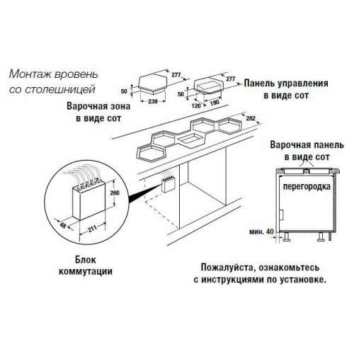 Варочная панель в виде сот Kuppersbusch EKWI 3740.0 S без рамки 11-ступенчатая регулировка мощности «glideControl» с красными индикаторами 1 специальная ступень: поддержание тепла около 70°С Память при отключении Автоматика закипания Индикация остаточного тепла Таймер с функцией отключения до 99 минут Централизованное отключение Принудительное отключение (ограничение продолжительности работы) 1 сенсорная панель управления в виде сот в комплекте 4 отдельные варочные зоны - 2 х Ø 20 см / 2300 Вт (3000 Вт*) - 2 х Ø 16 см / 1100 Вт (1400 Вт*) * при включении режима «Power» Распознавание и наличие посуды Внутри всех индукционных варочных зон в дополнение к системе распознавания посуды находится датчик распознавания размера посуды. Он определяет диаметр посуды и, при необходимости, включает дополнительный нагревательный элемент Сенсорное управление Работа варочных зон контролируется усовершенствованной электронной системой: для включения варочной зоны достаточно легкого прикосновения. К тому же, контроль за всеми остальными функциями упрощается благодаря сенсорной панели управления Таймер Таймер можно использовать на 3 или 4 варочных зон одновременно (в зависимости от модели). Таймер можно установить на промежуток времени от 0 до 99 минут для каждой варочной зоны Функция «STOP-AND-GO» Клавиша STOP-AND-GO обеспечивает высочайший уровень безопасности и комфорта. Функция позволяет при неожиданном звонке в дверь или вызове телефона одним касанием клавиши STOP-AND-GO отключить сразу все активные варочные зоны. При следующем касании клавиши работа варочных зон возобновится на прежнем уровне мощности Усиленный нагрев Индукционные варочные панели Kuppersbusch способны увеличивать мощность отдельных варочных зон при помощи подключения режима Power. Это позволяет при необходимости значительно ускорить процесс нагревания Характеристики: Потребляемая мощность: 7,4 кВт Размеры прибора (Ш х Г): 320 х 320 мм Глубина встраивания: 50 мм