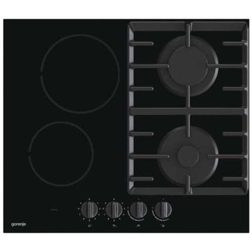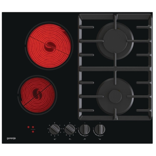 Независимая варочная комбинированная панель GORENJE GCE691BSC просторна и функциональна, благодаря увеличенному расстоянию между конфорками здесь можно свободно расставить посуду любого диаметра и объема. На столе из стеклокерамики установлены 2 газовые конфорки и 2 электрические. Управляется поверхность эргономичными поворотными ручками, установленными спереди на корпусе. Есть удобная опция автоматического электроподжига, позволяющая включать горелки, просто нажав на ручку и повернув ее до нужной отметки. С решетками из чугуна можно не опасаться за устойчивость кастрюль на плите, система «газ- контроль» гарантирует безопасность при случайном затухании пламени. Электрические конфорки оснащены датчиками остаточного тепла. Панель подойдет в семью из 3-4 человек с разными графиками питания.