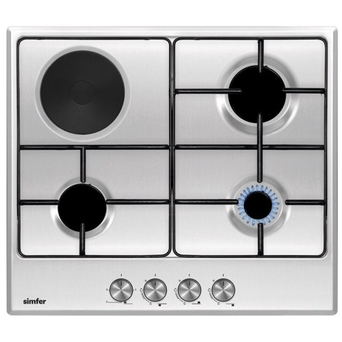 Тип панели: комбинированная варочная поверхность; Установка: независимая; Размеры (ШхГхВ): 59х52х5.5 см; Размеры для встраивания (ШхГ): 56x49 см; Специальные конфорки: электроконфорка; Материал панели: нержавеющая сталь; Количество конфорок: 4; Газовых конфорок: 3;