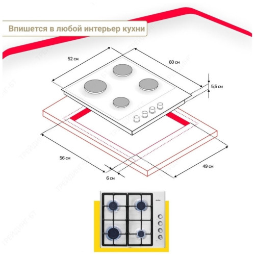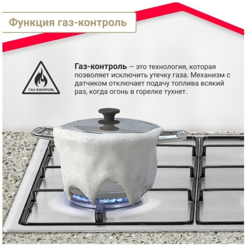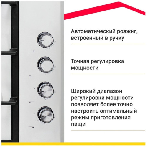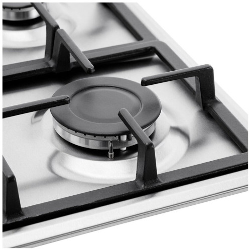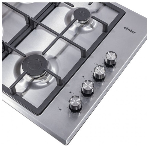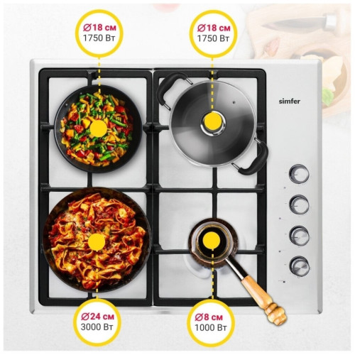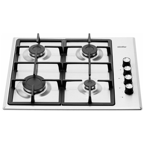 Газовая варочная панель Simfer H60Q40M572- модель, которая благодаря своим компактным размерам органично впишется в интерьер вашей кухни и сделает ежедневный процесс приготовления еды комфортным. 1 х большая конфорка 3000 Вт 2 х стандартная конфорка 1750 Вт 1 x экономичная конфорка 1000 Вт Материал решеток - чугун В качестве материала для изготовления варочной поверхности использовалась нержавеющая сталь, которая в разы упрощает утомительный процесс ухода за ним и делает процесс очистки лёгким и удобным. На ней располагаются четыре конфорки - разные по диаметру и мощности пламени в них. А значит вы сможете выбрать оптимальную конфорку для приготовления разнообразных блюд. В поворотные переключатели встроен электроподжиг, который значительно упрощает работу с панелью, а система газ-контроля предотвращает возможность случайной утечки газа в случае угасания пламени.